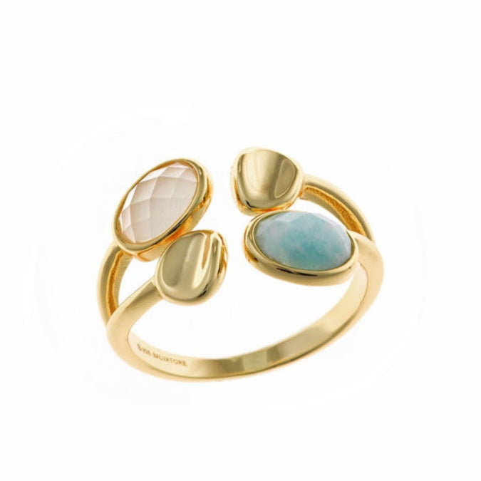 - Descripción: anillo de plata con chapado dorado, forma ovalada y una combinación de amazonita y vidrio. Una joya con personalidad que equilibra lo natural y lo sofisticado en un solo gesto.