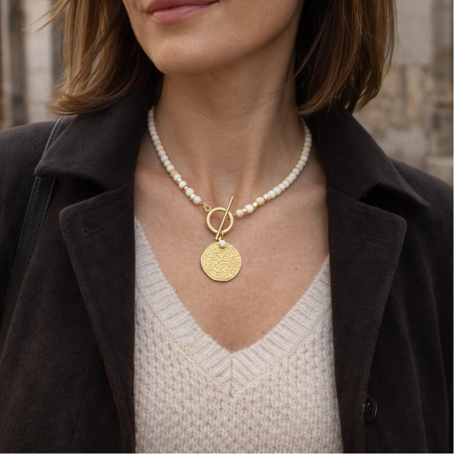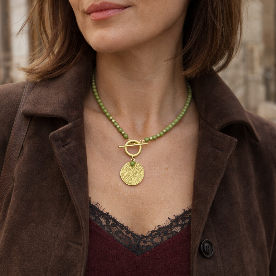 Una pieza de bisutería original compuesta por cuentas en tono verde lima con detalles dorados y cierre frontal tipo toggle que aporta personalidad y estilo. Su medallón grabado estilo amuleto convierte este collar en una joya con presencia, simbólica y actual.