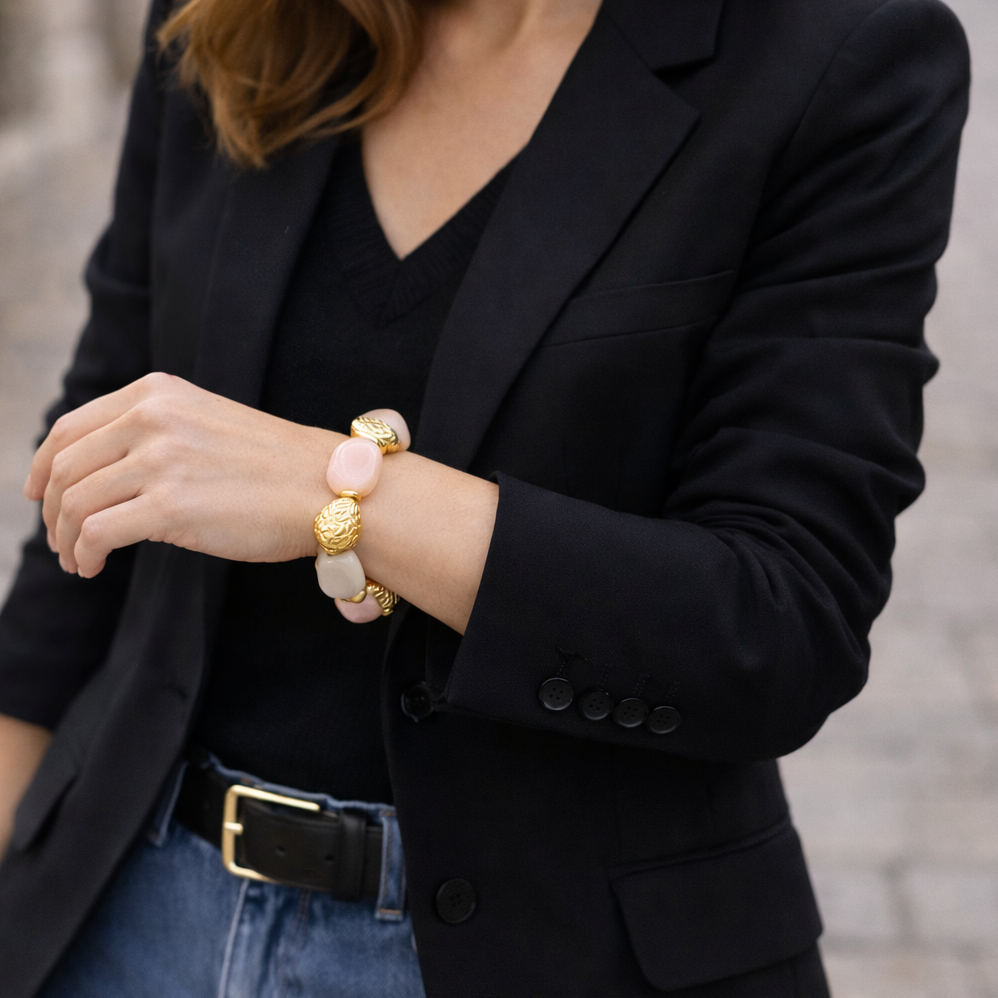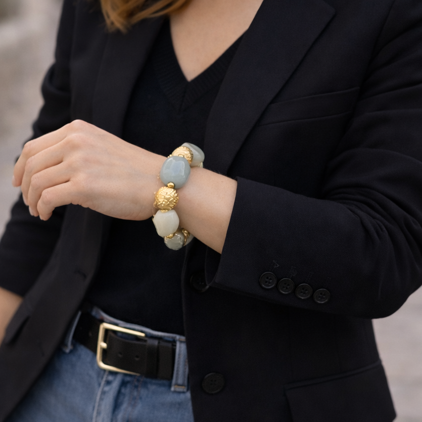 Una pulsera que transmite equilibrio y fuerza tranquila, pensada para acompañarte en el día a día con naturalidad.Está compuesta por cuentas de gran formato en tonos marfil y topo, combinadas con piezas doradas de textura orgánica, que aportan luz y carácter sin resultar excesivas. Su diseño elástico se adapta cómodamente a la muñeca, ofreciendo un ajuste natural y agradable.✨