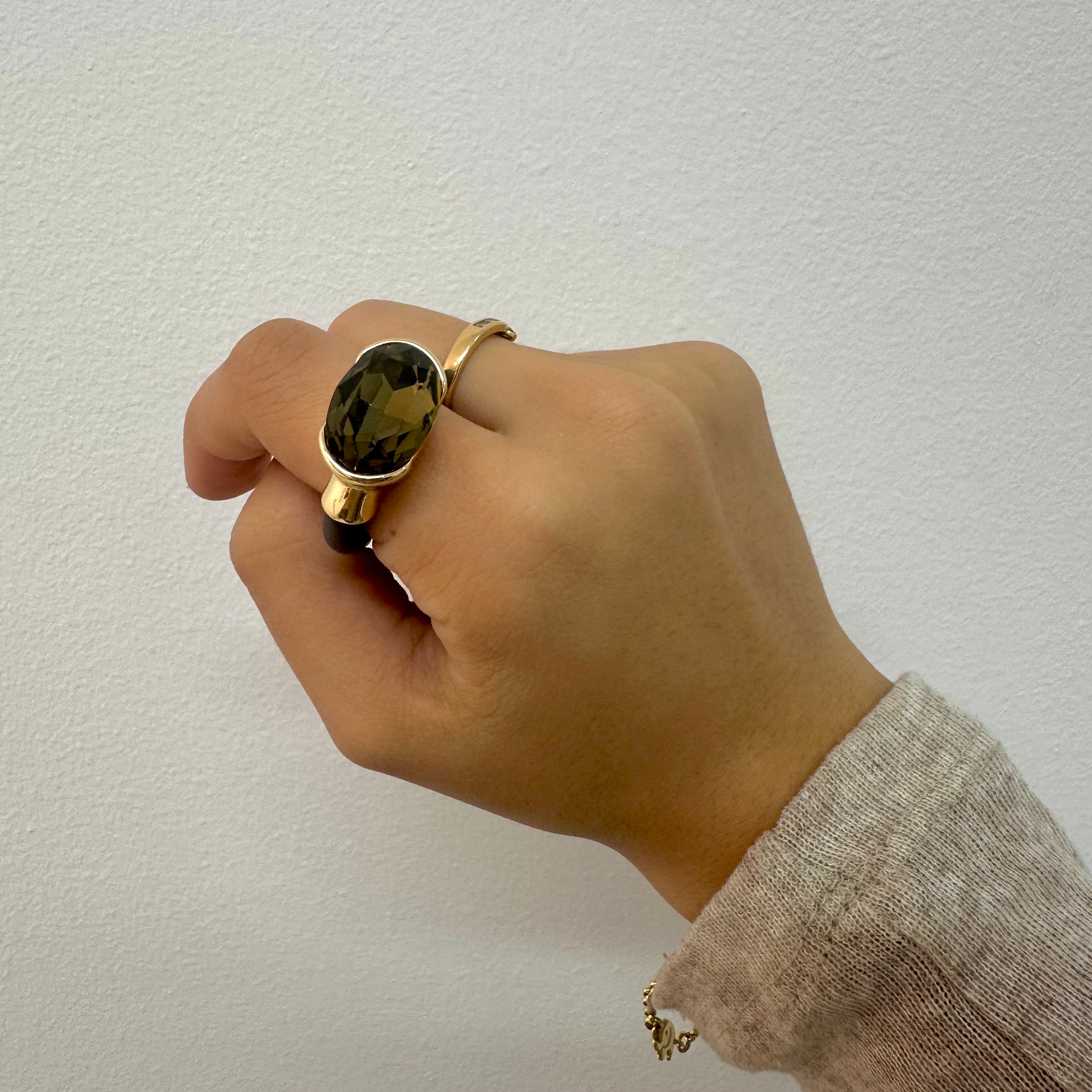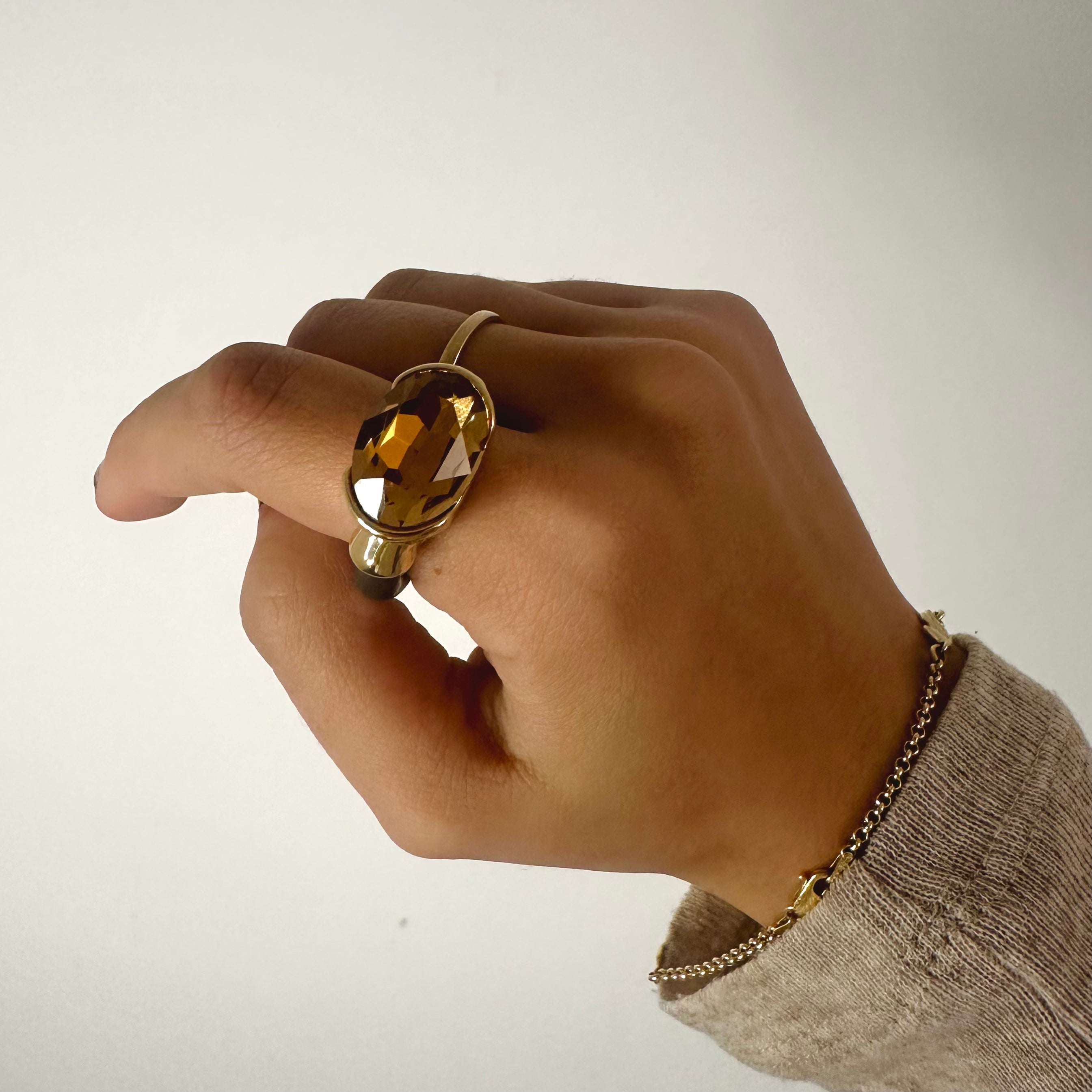 Anillo de cuero para mujer con acabado dorado y circonita tallada, diseñado para quienes buscan una joya con carácter y presencia. La combinación del cuero marrón natural con el latón bañado en oro de 18 quilates crea un contraste equilibrado entre fuerza y elegancia.